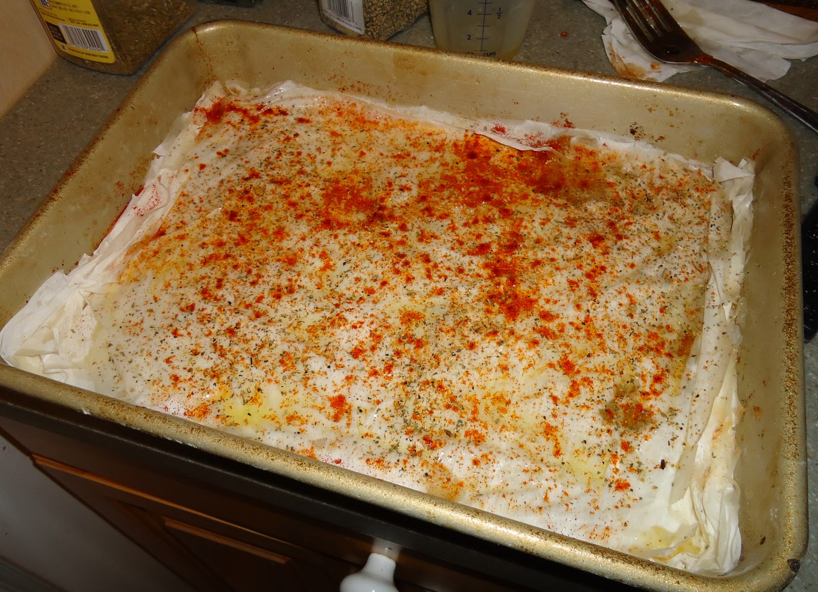 While thats cooling, Get your 9x13 pan out, coat the bottom with olive oil, not a lot, just enough to cover the bottom, Take your thawed fillo dough out of the fridge and, unroll it, and layer one sheet at a time,lightly brushing with olive oil between each sheet, 6 on the bottom, 6 on the top, After the first 6 layers are done, spread the filling evenly covering the the entire dough, then do the same thing you did with the bottom half, to the top half!