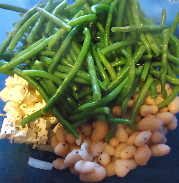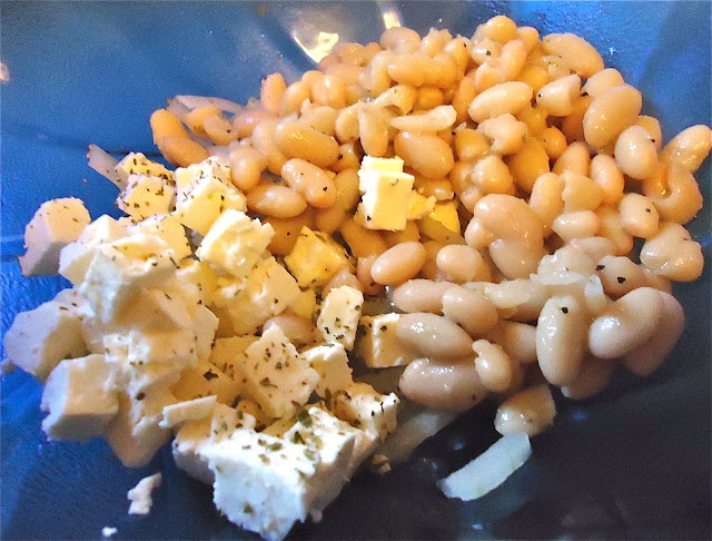 Drain your can of cannellini beans and rinse, heat them up in a small pot- add salt-pepper -garlic powder- oregano..mix well. Slice your onion, and 5 oz of Feta cheese don't forget to add the olives! Put it all in a bowl