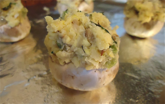 Wash mushrooms and pat dry, pop stems out, be careful not to break the shroom., place stems aside, along with minced celery,onion and garlic cloves.