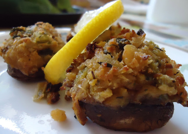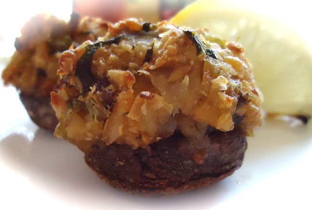 I used the basic method for making stuffed mushrooms, but with no cheese for this protein packed dish, I used Garbanzo beans for the base of the filling instead, and I think they came out great! These are not only tasty but low in fat, calories and healthy! I used lemon to top it off, Lemon is what really brings the flavors alive!