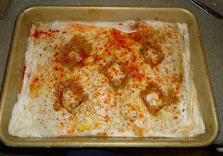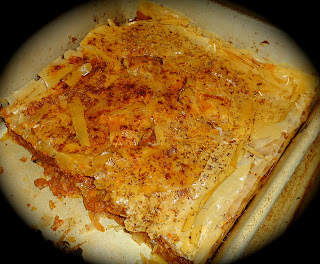 Once the thats all done, glaze the top layer of fillo with olive oil, and sprinkle paprika, pepper, and oregano, cut 5 diamond shapes and pop it into a 375 degrees pre-heated oven for 30-40 minutes, till its golden brown and crunchy, once its finished, let it cool;